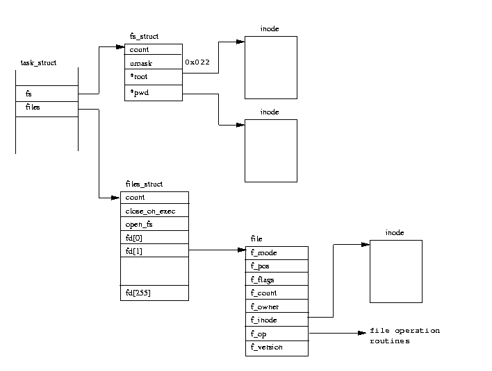 از task_struct پوینتر پایینی به یه files_struct اشاره میکنه که از فیلد ۴ به بعد فایل دیسکریپتورها (که از این به بعد بهشون FD یا فد میگم) شروع میشن. از اونجا که تو لینوکس تقریباً همه چی فایله، FDها رایجترین راه ارتباطی برنامهی ما با تقریباً هر چیزی در جهان بیرون اون برنامهن و از بین اونها هم ۳ تا فد اول معنای خاصی دارن: ورودی (اندیس صفر)، خروجی (اندیس ۱) و خطا (اندیس ۲).